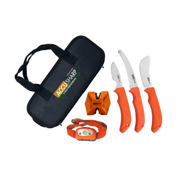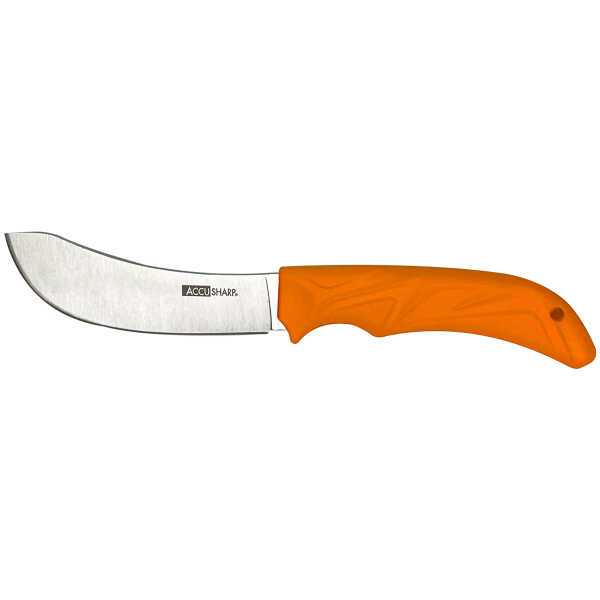 The AccuSharp AccuZip Skinning Knife is the ultimate knife for game processing. This 420 stainless steel knife, cuts underneath the skin without cutting through hair. The blunt tip feature prevents the knife from puncturing internal organs which can spoil the meat. The ergonomically designed handle in blaze orange is made with a non-slip rubber grip for comfort and ease of use. includes a nylon sheath and belt loop.