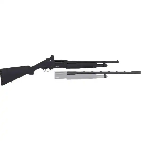 European American Armory Akkar Churchill 620 Combo, Pump, 20 Gauge 3″, 18.5″ & 26″ Barrels, Black, Red Dot Sight, 18.5″ Barrel has Ramp Front Sight and Cylinder Fixed Choke, 26″ Vent Rib Barrel has Fiber Optic Bead and Improved Cylinder/Modified/Full Chokes, 4 Rounds 111207
