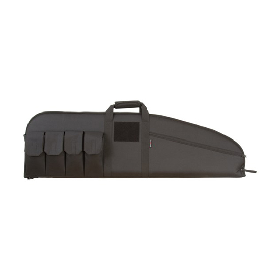 The Combat Tactical Rifle Case from Allen Tactical fits tactical rifles with or without scopes. Features four magazine pockets with hook and loop closures plus a large zippered accessory pocket that fits targets gloves ammo and other accessories. A large 5.25 x 4.25 hook and loop patch is perfect for adding morale and name patches. The exterior of the case is constructed from heavy-duty Endura fabric and the inside of the case has a soft knit lining and thick foam padding to protect your firearm. Includes durable web handles with a padded handle grip. Lockable.