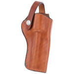 The sleek, 1L Lawman holster is designed for hi-ride carry with single-action revolvers. Constructed of full-grain vegetable-tanned cowhide, it features clean lines that deliver the classic look and feel of traditional Western holsters. The front strap closure wraps behind the hammer, offering secure retention. The holsters fold over belt loop is made for 1.75 in. (45 mm) to 2.25 in. (58 mm) belts and holds the revolver at an optimum drawing angle while riding in vehicles or on horseback. Meticulously crafted, the 1L Lawman holster is suede lined with ivory stitching and has an open muzzle. This model is compatible with Colt New Frontier 22 and Peacemaker with 6.5″ Barrel.