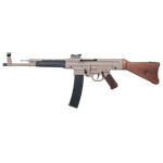 The STG 44 is a modern version of the Sturmgewehr 44 which was a German-made assault rifle used during World War II and considered the first of its kind. The GSG STG 44 is a .22LR model with a metal receiver and wood Stock – Caliber: .22 lr HV – Overall length: 946 mm – Overall heigth: 220.5 mm – Weight: 4.2 kg – Barrel length: 414 / 420 mm – Rifling length: 406 mm – Number of grooves: 6 – Sight lenght: 435 mm – Trigger pull: 2.500 g / 25 N – Magazine Capacity: 25 – System: Semi-Automatic