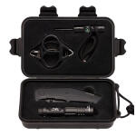 The Browning Outdoorsman Survival Kit Combo includes a blade assisted opening 8Cr13MoV stainless steel drop point blade with stonewashed finish and anti-skid grooves on blade spine with a black G-10 handle; pocket clip; two-finger stainless wire saw with figure 8 pull rings; flashlight with spot-to-flood beam and push button switch produces 50 lumens on high and 10 lumens on low from one AA battery (included); polymer handled combination fire starting flint/compass/survival whistle and a compact waterproof polymer case with O-ring seal.