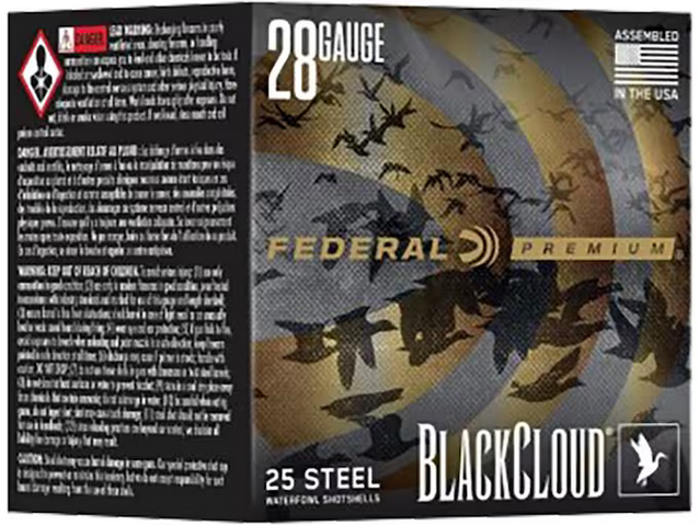 Federal Black Cloud ammunition takes non-toxic steel loads to the next level of performance. Equipped with the FLITECONTROL FLEX wad Black Cloud delivers improved pattern density and consistency through both ported and standard waterfowl chokes. The wads redesigned rear-deploying petals and side-mounted vents stimulate the payload for separation from the wad at the ideal moment for dense deadly patterns. Plus the efficient Catalyst lead-free primer and clean-burning temperature-stable propellant significantly decrease residue in the barrel. – Features – Rear-opening FLITECONTROL FLEX wad provides the tightest patterns possible through both ported and standard waterfowl chokes – Payload of 40 percent FLITESTOPPER steel pellets and 60 percent Premium steel for dense patterns and larger wound channels – Catalyst lead-free primer and clean-burning temperature-stable propellant drastically reduce residue – Black nickel head inhibits corrosion – Sealed crimp defeats moisture in extreme conditions – Specifications – Cartridge 28 Gauge – Quantity 25 Round – Shot Size #4 – Shell Length 2-3/4 – Shot or Slug Type Steel Shot – Muzzle Velocity 1400 Feet Per Second – Shot Weight 3/4 Ounce