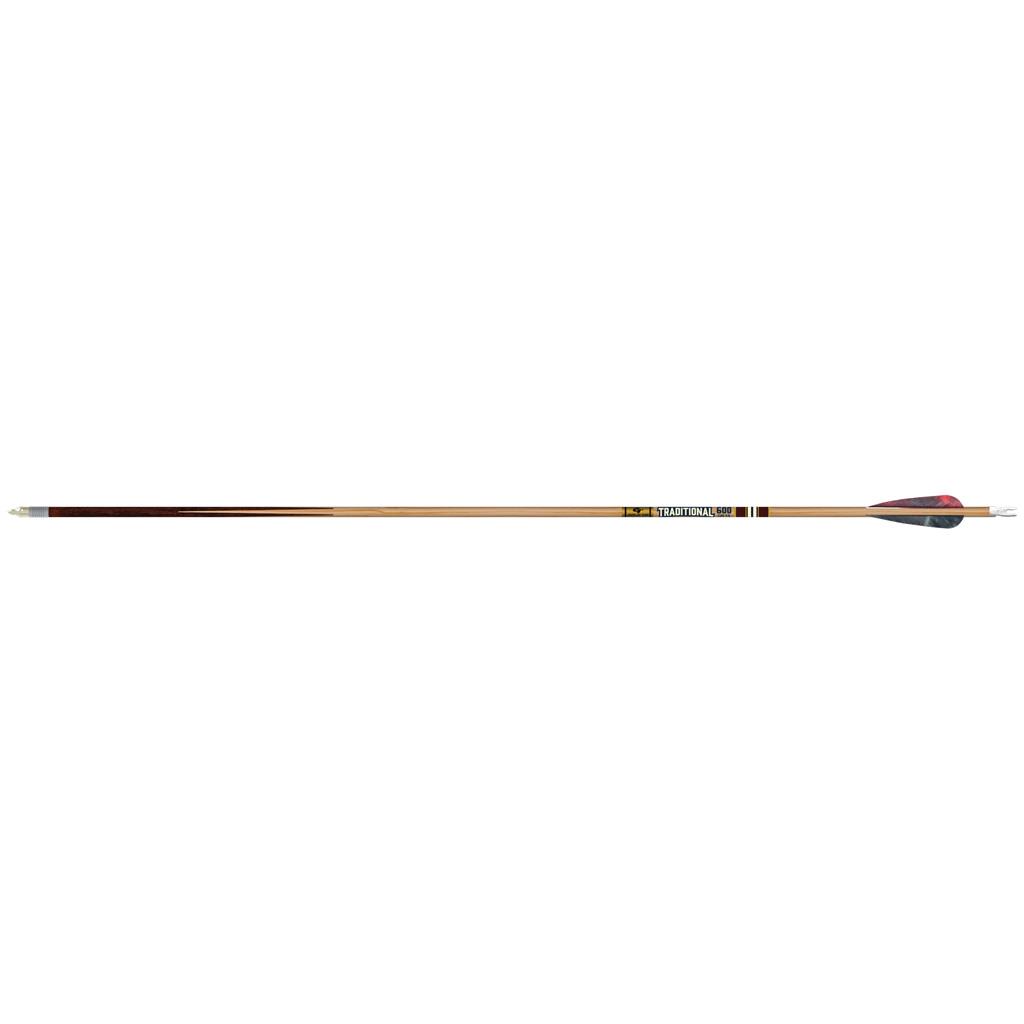 Built of a heavyweight, small diameter carbon that is ideal for the traditional archer. Features a wood grain finish with the look of custom footing. Straightness tolerance of +-.006” and weight tolerance of +-2 gr. Available in sizes 600 (9.0 GPI), 500 (9.8 GPI), 400 (11.4 GPI), and 340 (12.1 GPI). Includes nocks and stainless steel inserts for increased front of center. Factory fletched with 4” feathers.