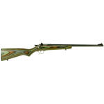 Crickett’s Single Shot 22 LR rifle features a camo laminate stock, adbjustable rear sight, and a bolt action constructed from alloy nickel plated steel.