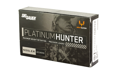 The Sig Sauer Platinum Hunter line of ammunition was created in partnership with the hunting experts at Meateater. This premium offering is precision-loaded with a Nosler Accubond projectile, delivering unmatched weight retention and deep penetration on big game. Each round is enclosed in a corrosion-resistant nickel case for smooth cycling, ensuring reliability in all conditions. And with waterproofing for extreme weather resistance, nothing will stop you from making the perfect shot.