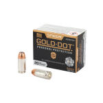 Gold Dot was the first handgun ammunition loaded with true, bonded-core bullets. Using an exclusive Uni-Cor method, Speer bonds the jacket to the core one molecule at a time at the very beginning of the bullet construction process. This virtually eliminates core-jacket separation. With options for both standard handguns and short barrels, there’s a Gold Dot load to fit any shooter. Each Gold Dot hollow point cavity is tuned by specific caliber and bullet weight to ensure optimum performance. Speer forms the hollow point cavity in two stages. The first establishes how far the bullet can expand; the second controls the rate of expansion. This patented two-step cavity formation gives Speer engineers incredible control in the design process. Each bullet caliber and weight is tuned for optimum expansion and penetration. The bullet is then finished to provide a smooth profile for reliable feeding in semi-automatic handguns. To ensure Gold Dot performs when you need it most, they first make sure it excels in the stringent tests developed by the Federal Bureau of Investigation for service-class handgun cartridges. These protocol tests evaluate penetration, expansion and retained weight in bare gelatin and gelatin shielded by common barriers.