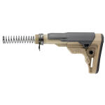 This is a UTG PRO AR-15 Ops Ready S4 Mil-spec Stock Kit molded from impact resistant high strength matte black polymer. It is complete with Mil-spec extension tube, buffer, buffer spring, receiver end plate, and castle nut. Its unique 4.28″ length with 4 position adjustability provides comfortable length of pull and ease of shouldering firearm when wearing a load bearing vest or plate carrier system. It is built for heavy duty use with the tightest tolerance controls to provide the most secure fit and function. Flat dark earth finish.
