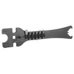 The Wheeler Basic Armorer’s Wrench will cover most of your AR-15 service needs with a single tool. An innovative layered and laminated stamped steel construction makes the tool durable. This construction method allows the use of hardened steel barrel nut pins designed to hold up to heavy torque requirements. A cut out for a 1/2″ drive allows the tool to be used with a torque wrench or ratchet driver. Profiles for buffer tube lock nut and flash hider are included. The addition of a bit driver and bit holder with six common bits adds to the versatility.